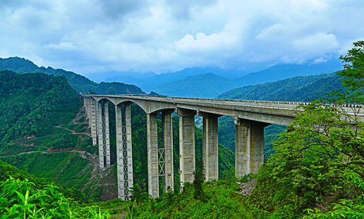 雅西高速公路臘八斤特大橋全長1106米,主橋為105+200*2+105米預應力混凝土懸澆連續鋼構,橋高230米。其主墩高182.6米,是目前世界同類型最高橋墩。其“鋼管疊合柱”和C80號混凝土自密實澆筑工藝,為我國橋梁首列。