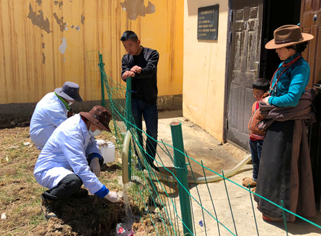 4月18日,項(xiàng)目組人員翻山越嶺,到達(dá)了位于海拔4300m的石渠縣城,開(kāi)展石渠縣地下水監(jiān)測(cè)工作。換上白大褂,戴上口罩和乳膠手套,項(xiàng)目組人員對(duì)縣城周邊包蟲(chóng)病防治地下水取水井進(jìn)行了全面的檢查和了解,做好相關(guān)調(diào)查記錄,并對(duì)典型井點(diǎn)進(jìn)行了采樣工作,為石渠縣包蟲(chóng)病區(qū)廣大人民群眾安全飲水保駕護(hù)航。