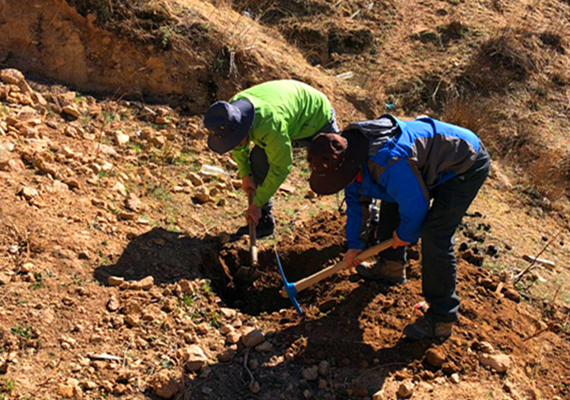 由于卡洛村郎機(jī)嶺溝泥石流勘查設(shè)計(jì)項(xiàng)目地處藏區(qū),語(yǔ)言不通等因素,項(xiàng)目組人員便自行購(gòu)置鋤頭、鐵鍬等工具,開(kāi)展槽探和采集樣品工作。頂著高原的烈日,在海拔近4000m的斜坡開(kāi)展詳細(xì)地質(zhì)調(diào)繪和地形圖測(cè)量工作,方便米飯和涼水便解決了一日三餐,但項(xiàng)目組人員沒(méi)一人喊苦叫累。終于,經(jīng)過(guò)兩天的辛苦工作,項(xiàng)目組順利完成了郎機(jī)嶺溝泥石流勘查設(shè)計(jì)項(xiàng)目野外工作。